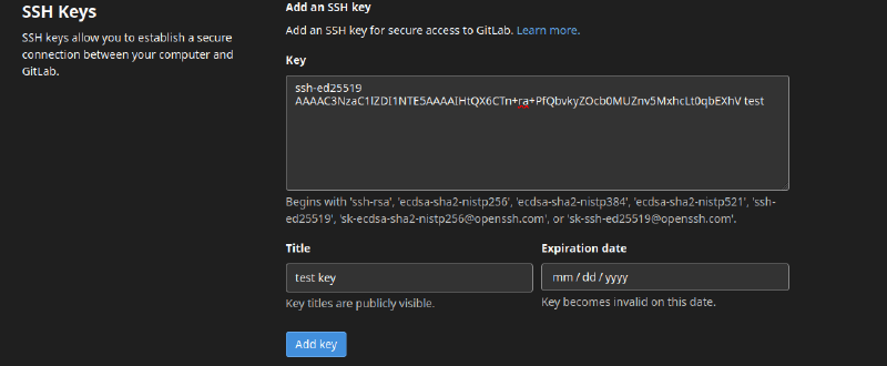 cat ~/.ssh/gitlab_key.pub copy the whole string,